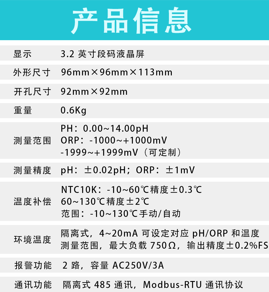 適用場合:PH/ORP測試儀是一款智能在線化學(xué)分析儀器之一,是一款廣泛應(yīng)用于火電、化工化肥、冶金、環(huán)保、制藥、生化、食品和自來水等溶液中PH值或ORP值和溫度的連續(xù)監(jiān)測。 連續(xù)監(jiān)測數(shù)據(jù)通過變送輸出連接記錄儀實現(xiàn)遠傳監(jiān)控與記錄,也可以連接RS485接口通過MODBUS-RTU協(xié)議可方便聯(lián)入計算機實現(xiàn)監(jiān)控與記錄。